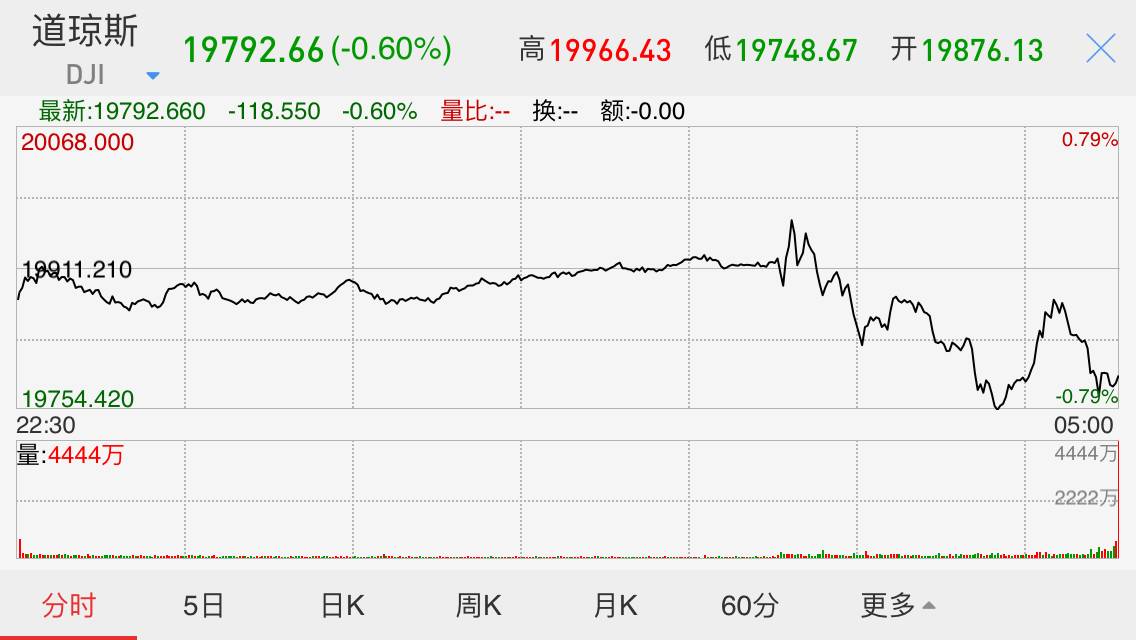 截至美股收盘,标普500指数跌18.44点,跌幅0.81%,报2253.28点。道琼斯指数跌118.55点,跌幅0.60%,报19792.55点。纳斯达克指数跌27.16点,跌幅0.50%,报5436.67点。