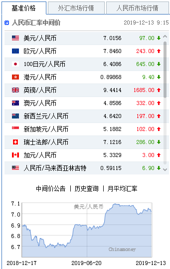 新浪财经讯 12月13日,美元指数持续走弱失守97关口,人民币中间价报7.0156,上调97点,上一交易日中间价报7.0253,在岸人民币上一交易日收报7.0333。