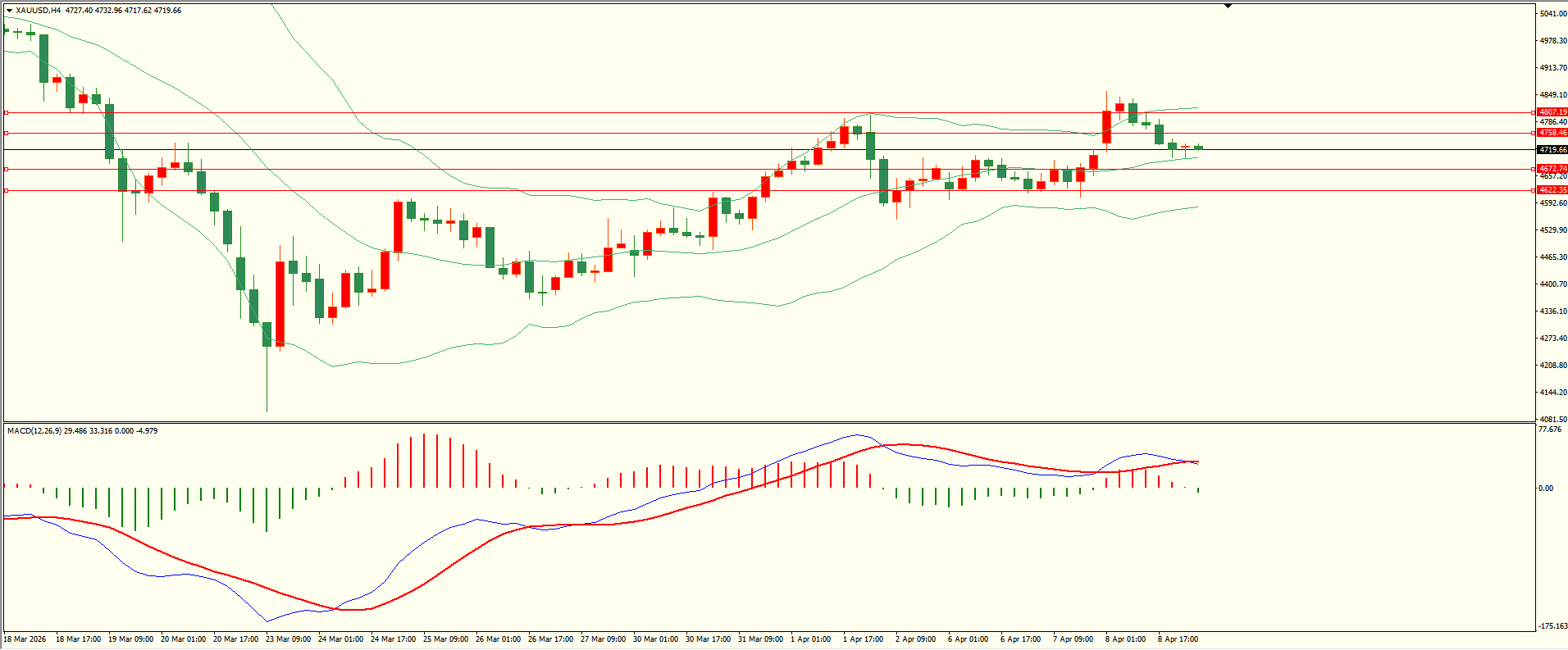 黄金昨日亚市开盘后延续反弹,盘中触及第一阻力下方承压下行,日线报收上下影线小阴线,从收盘来看,阻力与支撑并存,短线的多空争夺尚未结束,结合4H来看,布林上下轨略有收窄,MACD零轴上方运行,日内上方首要阻力4758-60,第二阻力4806-07,下方支撑4672,4622,第一阻力在没有收复前短线有望测试第一支撑。