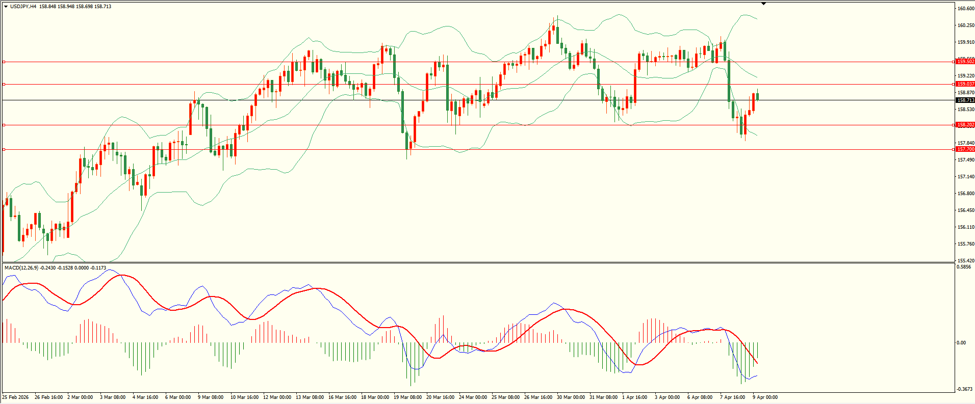 美日昨日亚市开盘后延续走低,纽约盘时段回落至第一支撑展开反弹,日线报收中阴线,日线布林下轨构成下行重要支撑,失守后方可打开下行空间,从4H来看,布林中轨偏下,MACD零轴下方运行,日内上方首要阻力159.00,第二阻力159.50,下方支撑158.20,157.70,保持在第一阻力下方短线有望回测第一支撑。